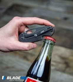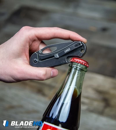 The CRKT Bev-Edge is a compact flipper knife with a bottle opener on the back spacer. Designed by custom knife maker, Eric Ochs, the Bev-Edge is based on his custom Lagoon model. It features a black stonewashed tanto blade made from 8Cr13MoV, stainless steel handles, and a frame lock.
